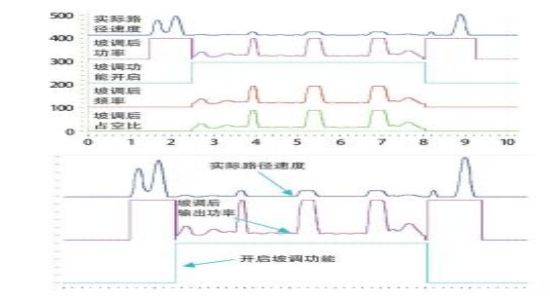 激活坡調功能后,根據實時數據采集可以看出激光器實際輸出功率、頻率、占空比均可以跟隨路徑速度實時變化,三種坡調功能可根據實際需求分別開啟,對比工件實際切割效果,切割毛刺改善明顯。
