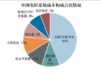 電控系統(tǒng)是新能源汽車(chē)的“大腦”,控制整個(gè)車(chē)輛的運(yùn)行與動(dòng)力輸出,主要由逆變器、逆變驅(qū)動(dòng)器、電源模塊、中央控制模塊、軟起動(dòng)模塊、保護(hù)模塊、散熱系統(tǒng)信號(hào)檢測(cè)模塊等組成,其中逆變器負(fù)責(zé)蓄電池的直-交轉(zhuǎn)換,從而驅(qū)動(dòng)電機(jī)運(yùn)轉(zhuǎn)。其中IGBT功率半導(dǎo)體模塊應(yīng)用于逆變器中,是新能源汽車(chē)電控系統(tǒng)和直流充電樁的核心器件,被稱(chēng)為電力電子的“CPU”,占整個(gè)控制器成本的40-50%左右。